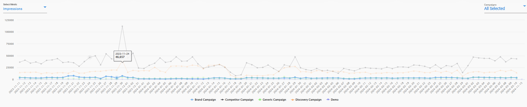 - On the Campaign Page as well, User can compare and have chart visualization of upto 5 Campaigns for the Metric Selected.