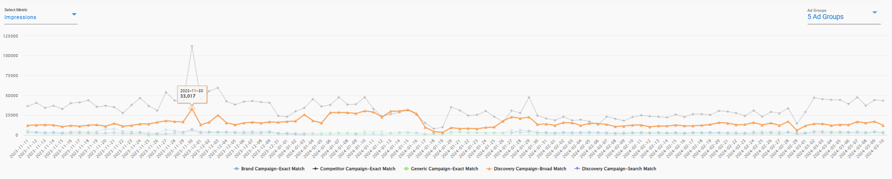 - Similarly, the user can compare and get a chart visual of upto 5 Ad Groups at the same time for the particular Metric selected.