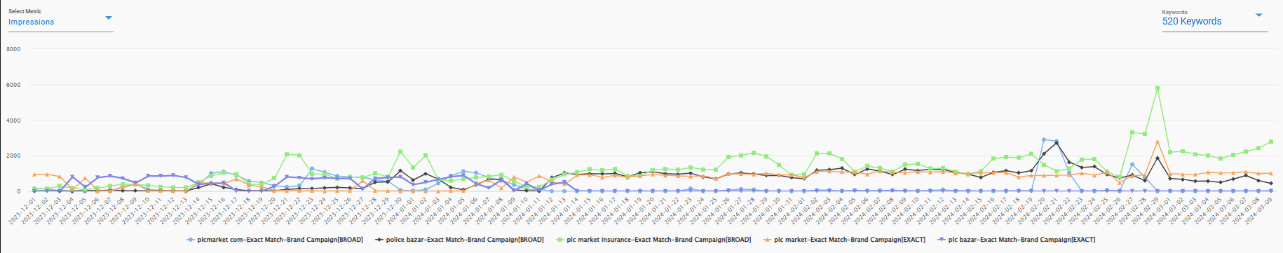 - Similarly, the user can compare and get a chart visual of upto 5 Keywords of a particular campaign or 5 in total from mix od all the campaigns at the same time for the particular Metric selected. -
